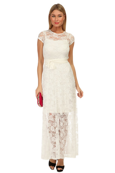 Удивительно нежное и воздушное платье на чехле из белого кружева! Нижний слой выполнен из тонкой эластичной ткани, длиной выше колен, на тонких бретельках. Верхний слой  - эластичной кружево, длиной в пол, с короткими рукавами. Пояс в комплекте.